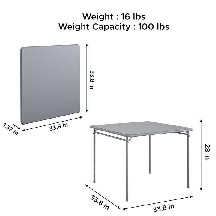 COSCO 34" Square Vinyl Top Folding Table allows you to unfold some fun with a versatile design perfect for indoor or light outdoor use. This table is a great addition for any atmosphere including small space living areas, dining rooms, work areas, family gatherings, and all kinds of events which require extra seating for guests. The table's steel frame makes for a durable workstation while remaining flexible for multipurpose uses when it comes to your indoor or outdoor entertainment. One of the main features which makes this product ideal for families and parties is the vinyl tabletop - this surface is easily maintained and holds up against all kinds of messes. The non-marring legs tips on the legs provide extra peace of mind, guaranteeing protection for all floor surfaces and non-slip properties. When the evening is over, this versatile piece also saves space and time when it's time to tear down - the table's legs fold into the tabletop, the result just 1.5 inches wide for easy, non-invasive storage. Rated for 200 lbs. weight capacity and 1-year limited warranty included.