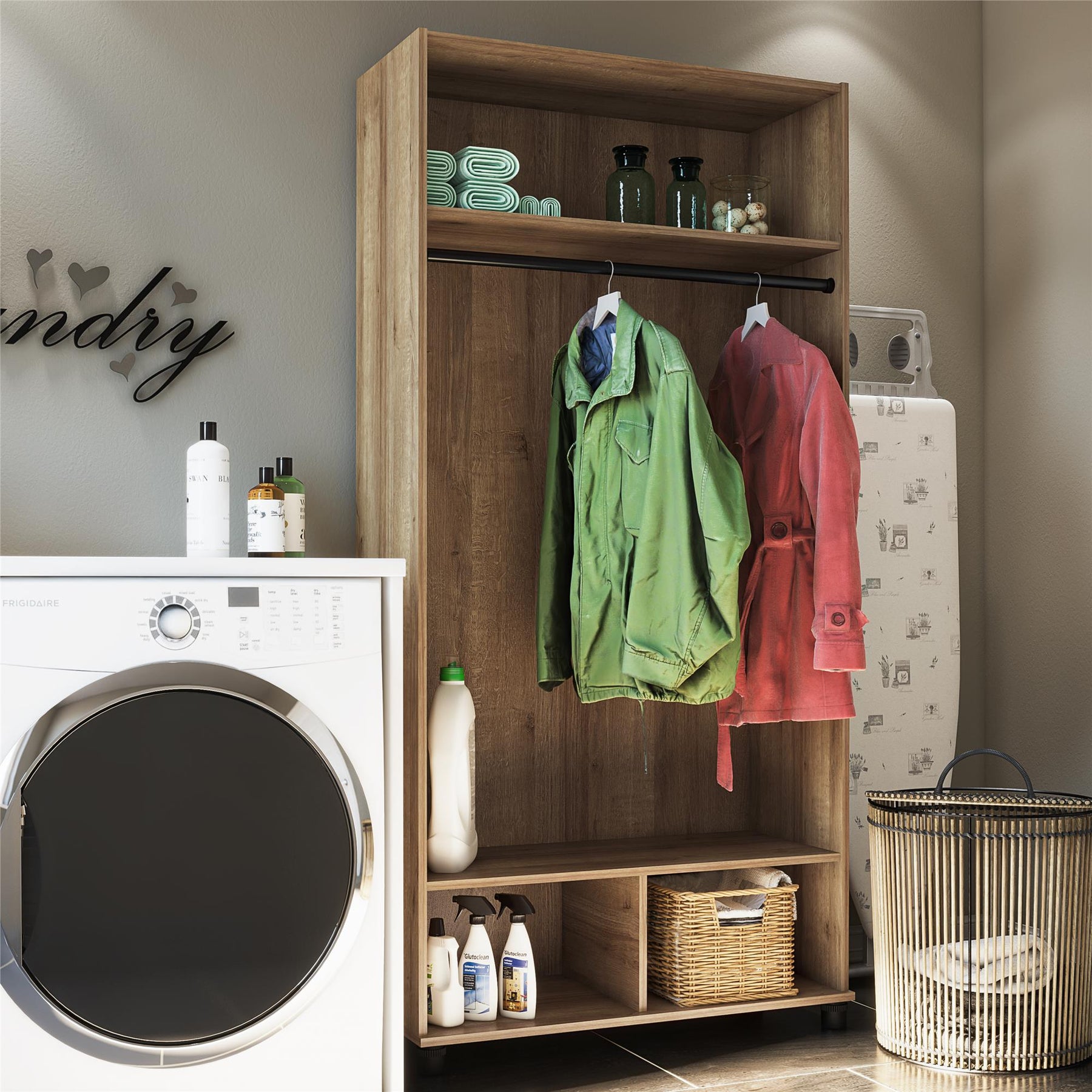 Get organized from the moment you walk in the door with the Basin 36" Wide Mudroom Storage Cabinet with Adjustable Shelving. Made of laminated particleboard in a neutral finish, the Basin Mudroom Cabinet is both attractive and affordable. The interior of this Cabinet features 2 lower cubbies for shoes or bins, a lower shelf perfect for backpacks or purses, a coat rack, and an upper shelf for hats, gloves and other essentials. Perfect for back to school to keep coats and backpacks in one place for a smooth, no fuss morning routine. Limited spacee The Basin Mudroom Cabinet works great in the garage or basement as well. With adjustable feet, keeping your Cabinet level on uneven floors is simple. A wall anchor kit is included to secure the Cabinet to the wall and prevent tipping injuries. Use this piece as a stand-alone item, or combine it with additional Basin items to create the perfect storage solution for every area of your home. The Wide Mudroom Cabinet ships flat to your door and 2 adults are recommended to assemble.