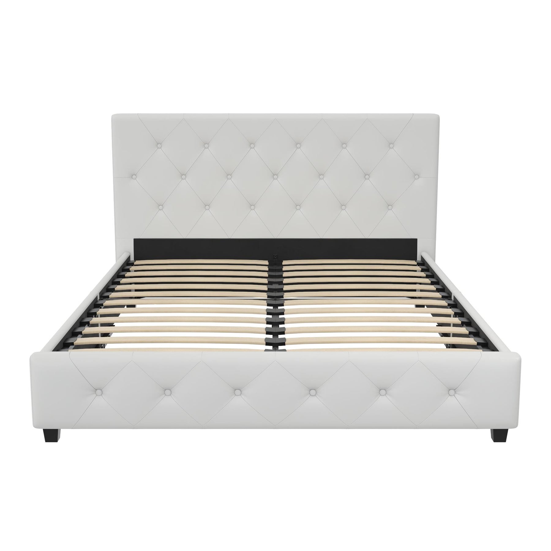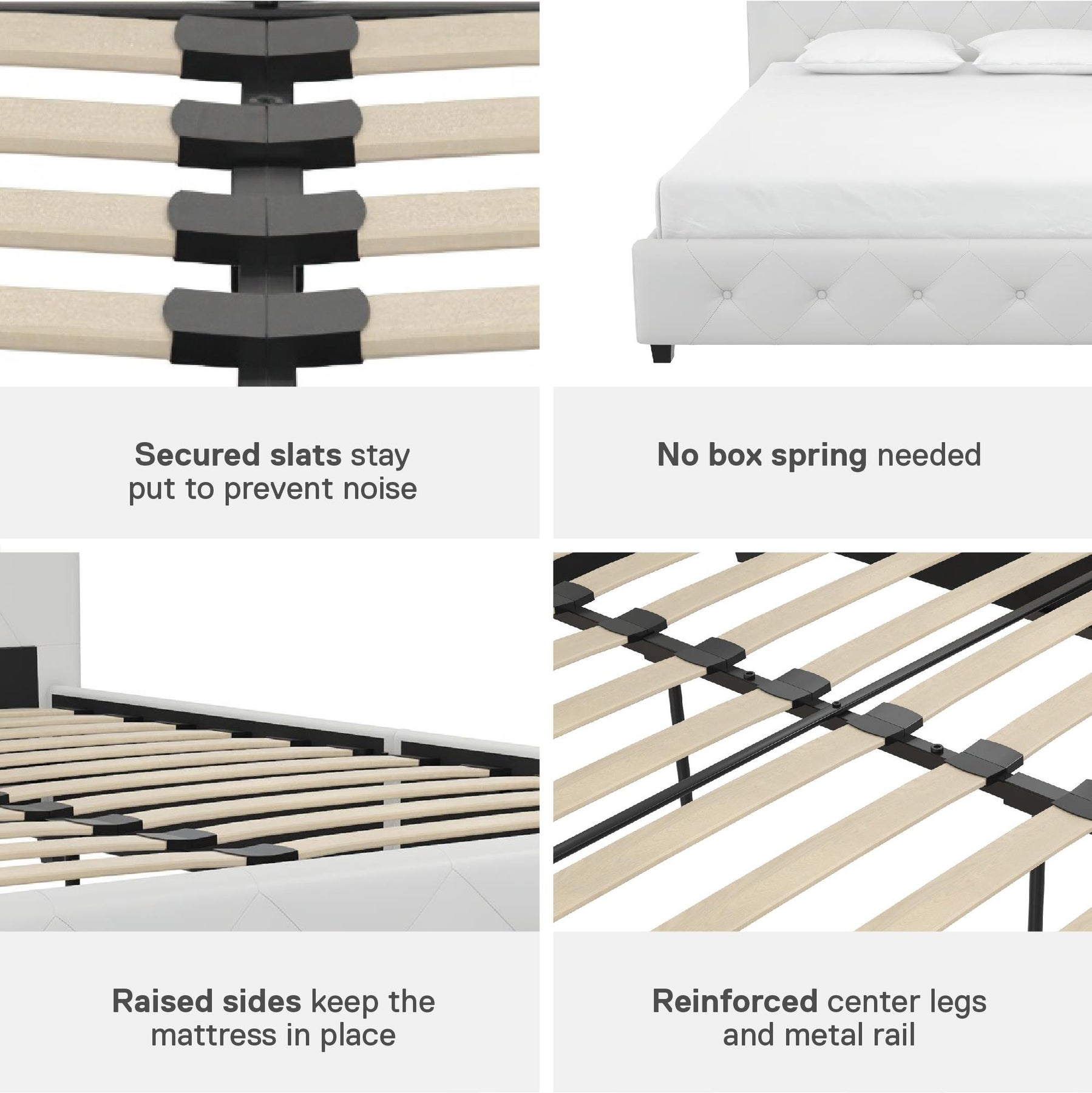 Introducing the DHP Dakota Upholstered Platform Bed! This gorgeous bed is perfect for anyone looking to add a touch of luxury and style to their bedroom décor. The headboard features stunning diamond button tufting that radiates contemporary chic, while the upholstered faux leather fabric and padding provide superior comfort. The sturdy bentwood slat system not only provides extra support, it also promotes mattress breathability to keep your mattress fresher for longer. Additionally, the slats remove the need for a box spring or foundation. The Dakota is built with metal side rails for stability and durability, as well as a center metal rail and leg for added support. This bed is sure to transform your bedroom into a stylish oasis you'll love coming home to!