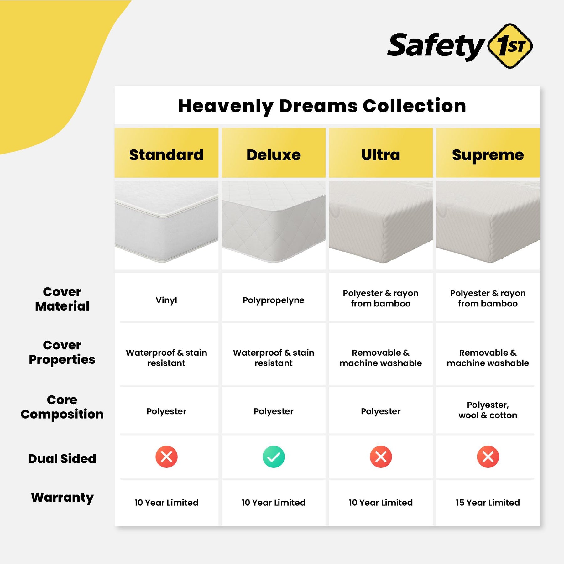 Let your little one dream big with the Safety 1st Heavenly Dreams Crib and Toddler Bed Mattress. The high-density thermo-bonded polyester core offers ultra firm support to ensure a restful night of sleep. This durable baby mattress is lightweight and easy to maneuver and flip; plus, it makes nighttime wake ups quick and simple thanks to the waterproof and stain resistant 100% Vinyl cover that wipes clean in no time. This Safety 1st mattress is made without the use of flame retardant chemicals and has achieved GREENGUARD Gold certification, meeting the standard for low-chemical emissions for a sleep environment that's always safe and sound. Assembled in Canada, this Safety 1st mattress comes with a 10-year limited warranty.