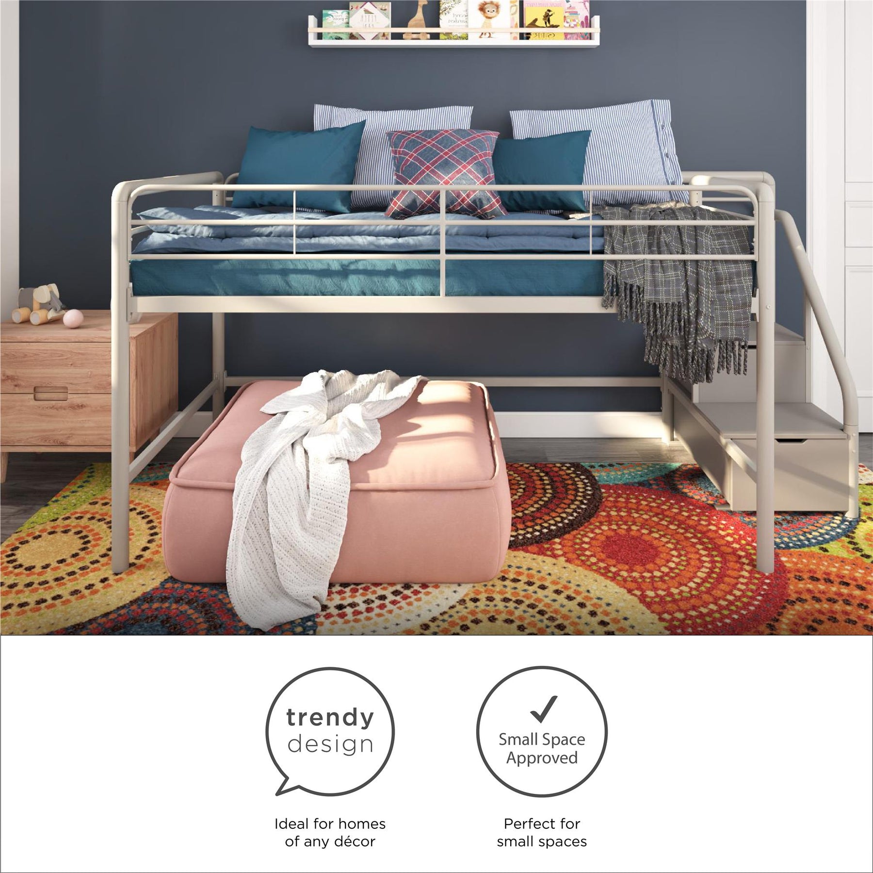 The RealRooms's San Junior Metal Loft Bed with Storage Steps is a great small space Sanution for any kid's room. Built with a shorter than typical frame height, this loft bed wants to make sure that your kids are 100% safe. It includes a built-in storage steps and full-length guardrails to ensure that the construction is secure and sturdy. What's even better, the steps include two storage drawers that provide the perfect place for your children to neatly store their toys and books. No more excuses for a messy room! Under the loft, they also have more than enough space to play or do homework with their friends. Made for use without any additional box spring or foundation, this Junior Loft Bed with Storage Steps comes in multiple colors combinations and accommodates a standard twin size mattress (Sand separately). Suggested use with a mattress between 4" and 6". Children must be over 6 years of age to use the upper bunk bed.