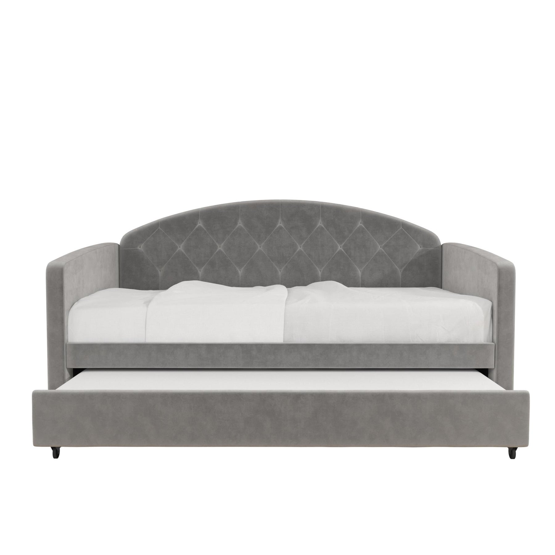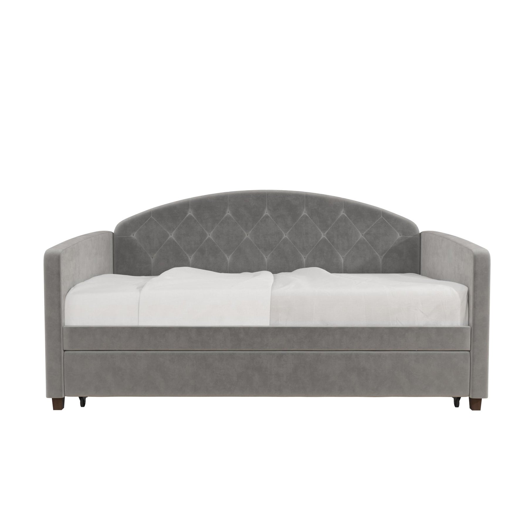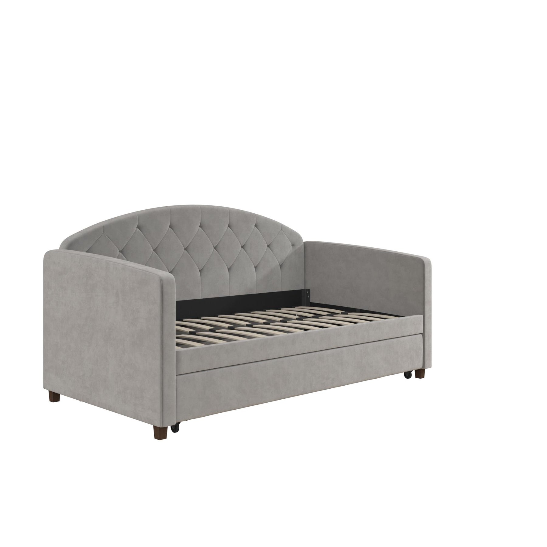 Need a modern furniture piece that exudes beauty, function, and intelligent design – well, we've got you covered! The DHP Ilena Upholstered Daybed and Trundle will surely transform any space into a luxe retreat. Upholstered in lush light gray velvet, it showcases an attractive rounded headboard with classic diamond tufted detailing. Designed for real life, the Ilena is an ideal space saver thanks to its roll out trundle which lets you easily host overnight guests without a fuss. After a late night with friends or family, simply pull out the trundle and lock it into place and roll it back once your guests have gone. Talk about a fast and easy storage solution! In addition, the Ilena features a sturdy bentwood slat system both in the daybed and trundle to provide optimal mattress support and breathability eliminating the need for any extra box spring or foundation. Mattresses not included. Available in Twin or Full sizes to best suit your needs, the DHP Ilena Upholstered Daybed and Trundle will have everyone talking!