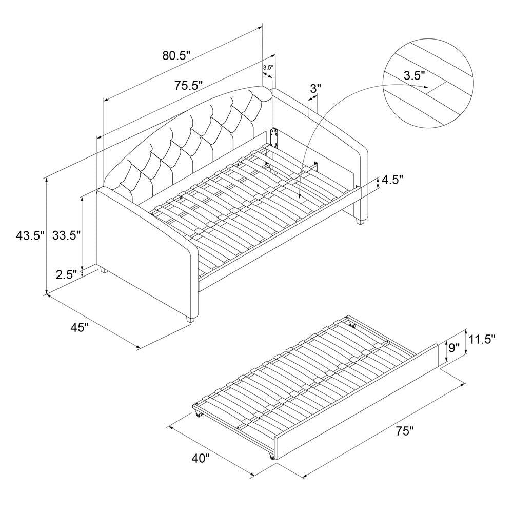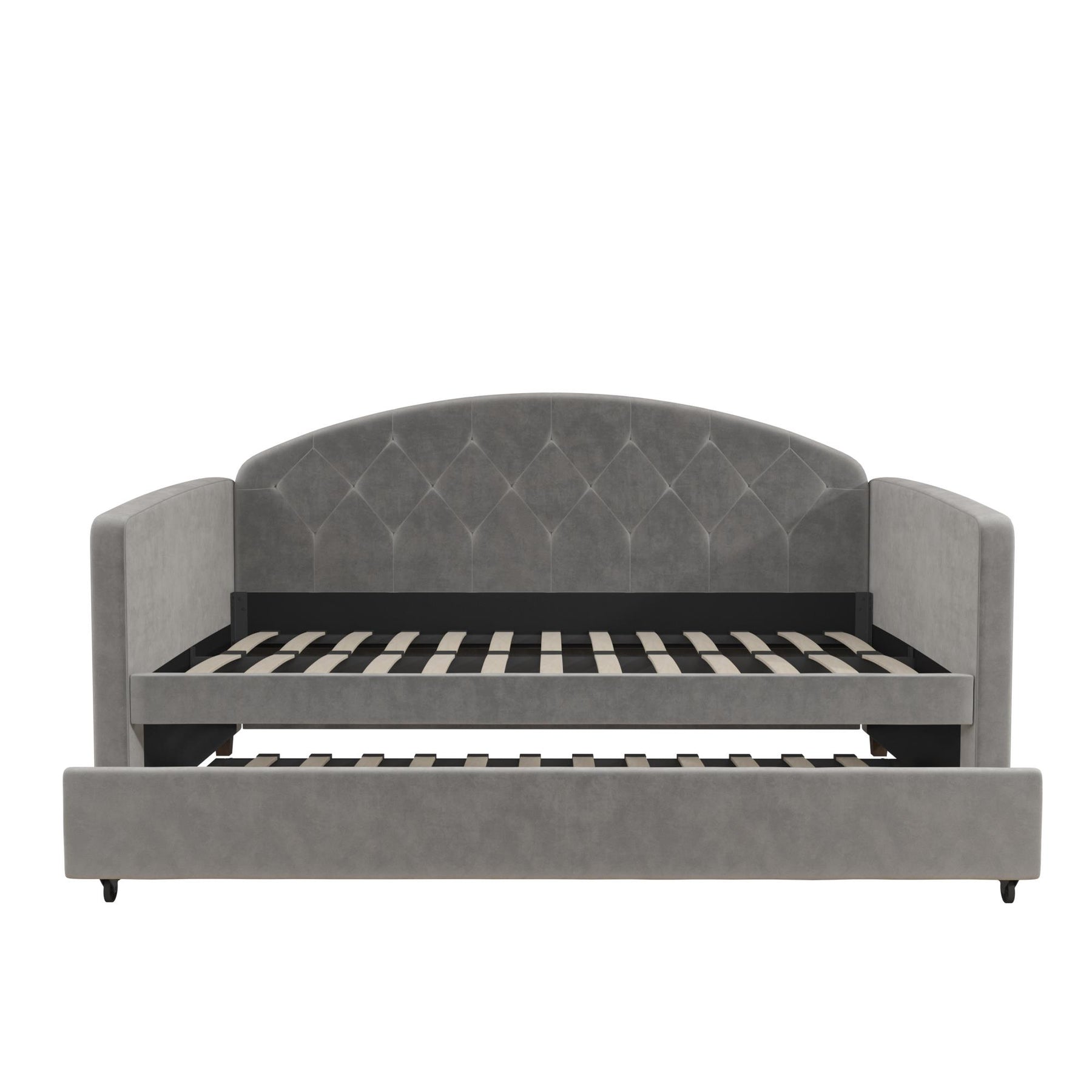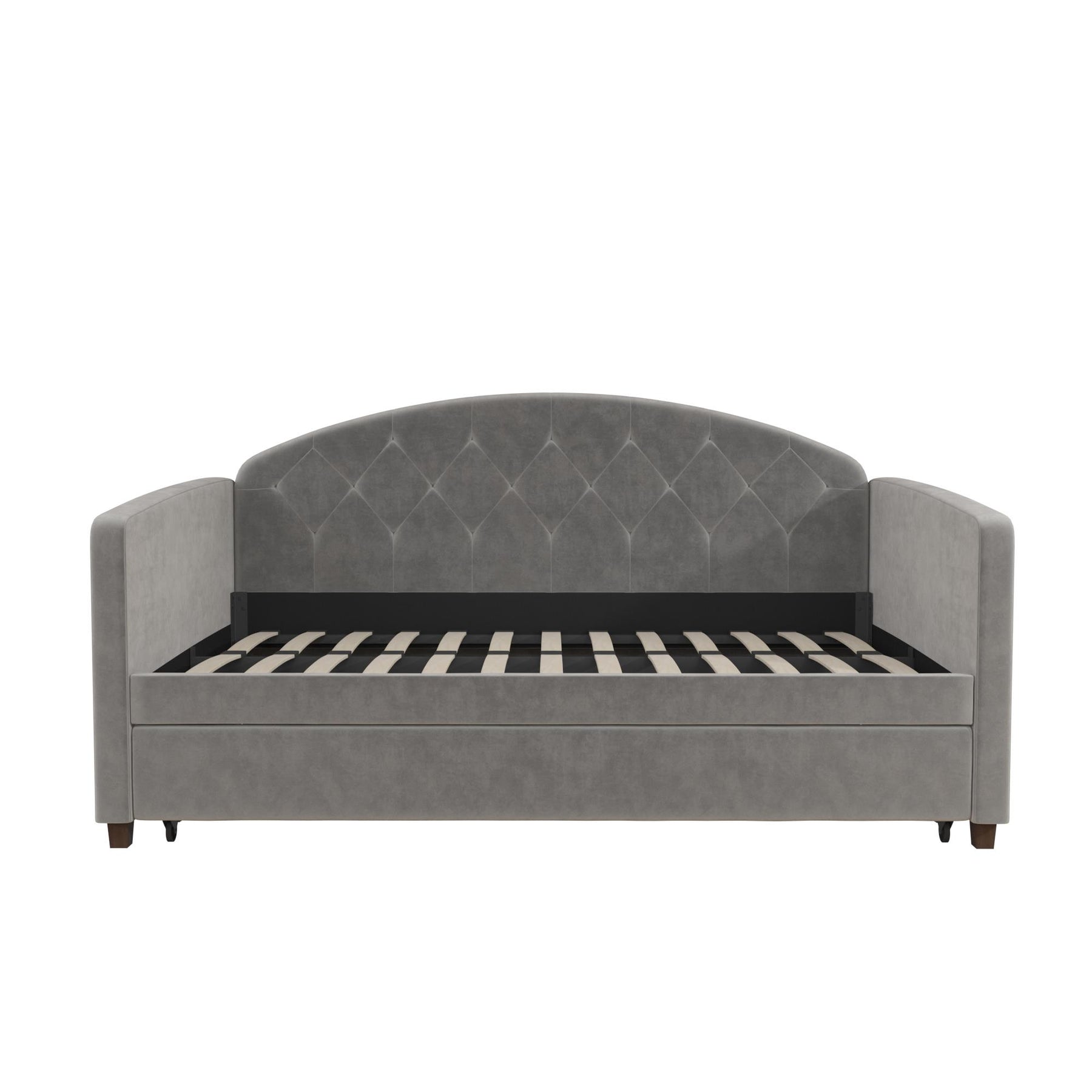 Need a modern furniture piece that exudes beauty, function, and intelligent design – well, we've got you covered! The DHP Ilena Upholstered Daybed and Trundle will surely transform any space into a luxe retreat. Upholstered in lush light gray velvet, it showcases an attractive rounded headboard with classic diamond tufted detailing. Designed for real life, the Ilena is an ideal space saver thanks to its roll out trundle which lets you easily host overnight guests without a fuss. After a late night with friends or family, simply pull out the trundle and lock it into place and roll it back once your guests have gone. Talk about a fast and easy storage solution! In addition, the Ilena features a sturdy bentwood slat system both in the daybed and trundle to provide optimal mattress support and breathability eliminating the need for any extra box spring or foundation. Mattresses not included. Available in Twin or Full sizes to best suit your needs, the DHP Ilena Upholstered Daybed and Trundle will have everyone talking!