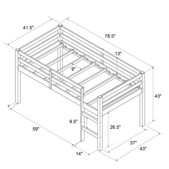Encourage your child's creative side with the pleasant and playful layout of the DHP Milton Junior Twin Loft Bed. With a sturdy pine wood-constructed bed frame that shows off charmingly finished bed posts and paneling, our kids' bed brings a contemporary look that draws attention to its clean lines, horizontal paneling, and space-saving modern shape, easily fitting into any boys' or girls' decor. The bed's low-profile height ensures safe access to the top bunk at bedtime, combined with an area below that can be used for storage, reading, building a fort, or whatever childhood imaginations can dream up. Perfect for small spaces, the Milton features an easy-to-climb stepladder and full-length guardrails for additional protection. Delivering 'Mission'-inspired design to your kid's bedroom or guest room, it checks off all the style and safety boxes. Plus, straight wooden bed slats offer complete support for your kid's 6-inch-thick twin-size spring mattress (not included) without a box spring. Children must be at least 4 years old to use the top bunk.