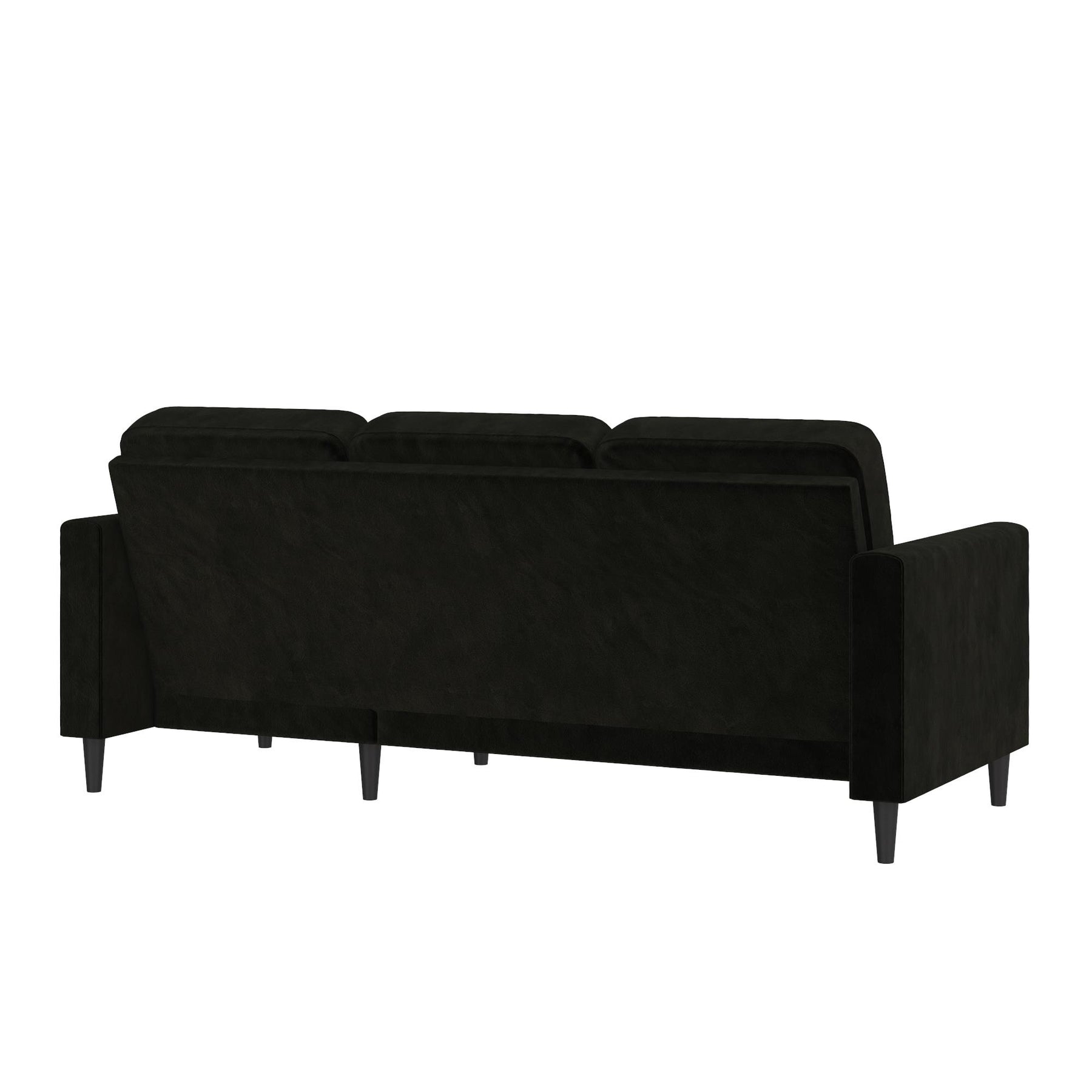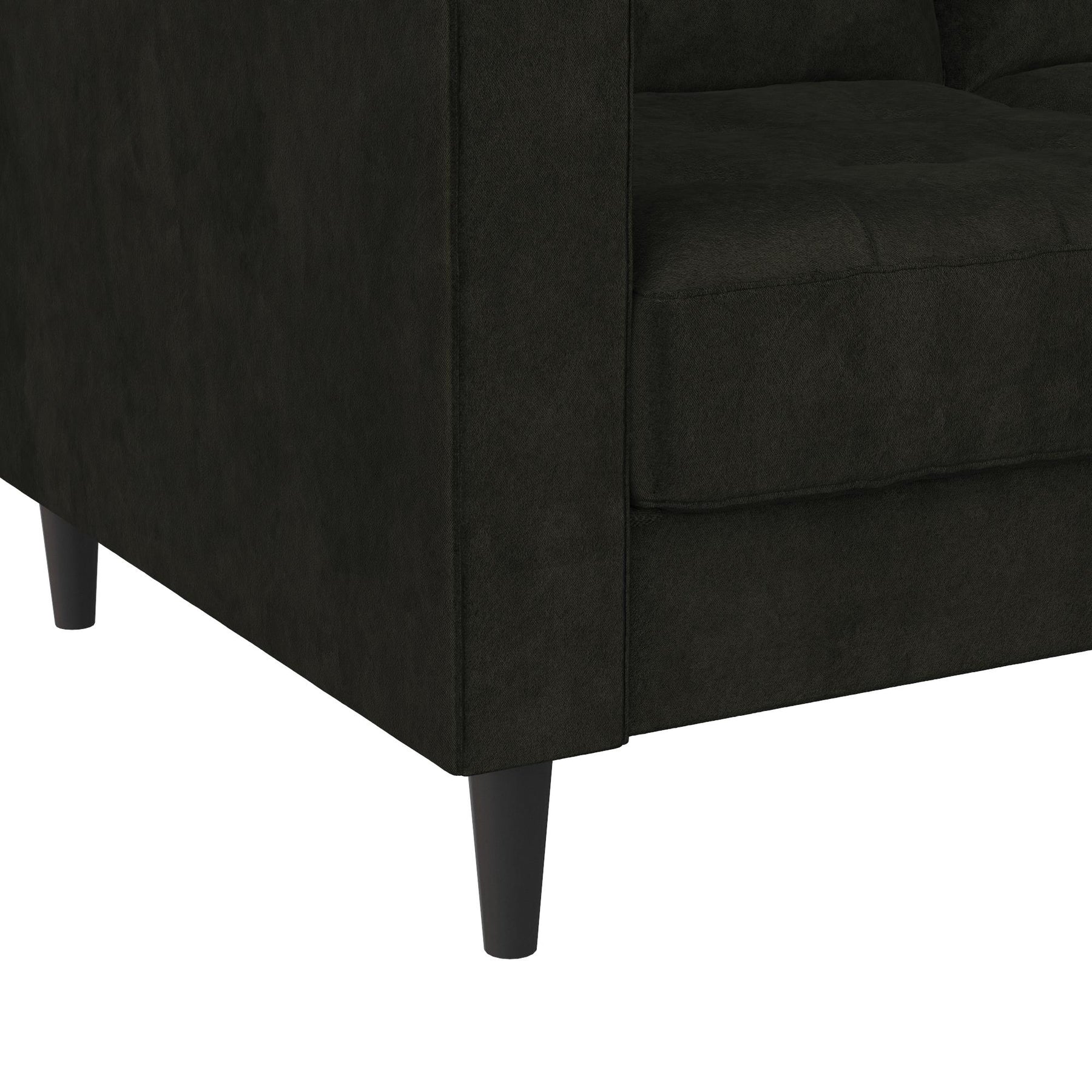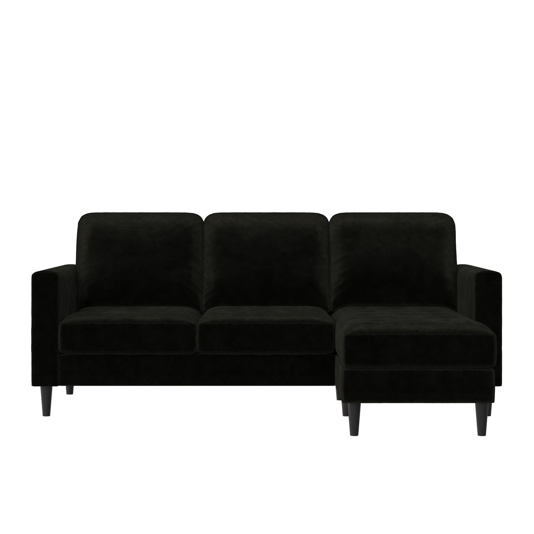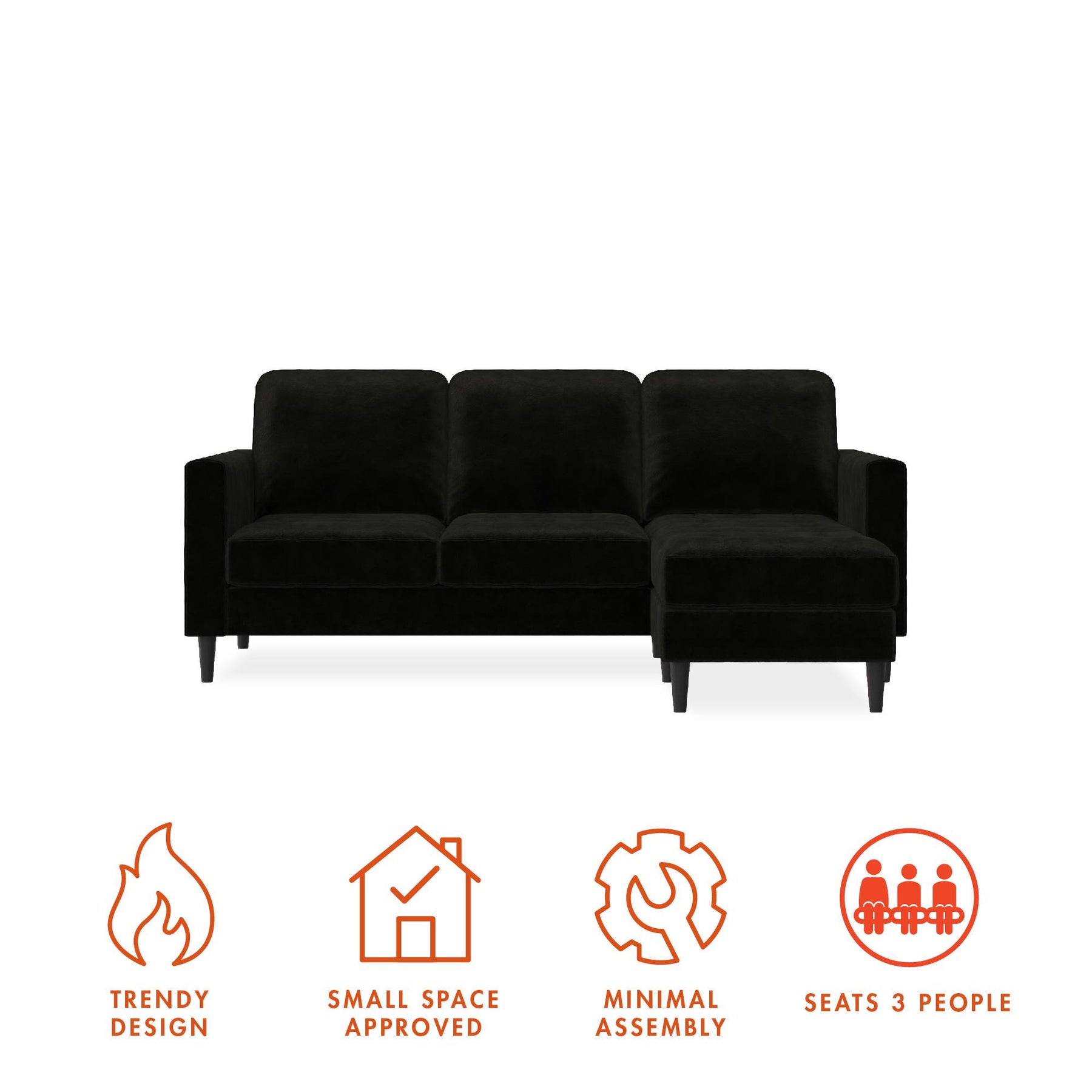 Glamify your sanctuary with the CosmoLiving Strummer Sectional Sofa. Covered in lush black velvet upholstery, the sofa is perched on sleek contrasting black legs for durability. Here are the deets: the Strummer's compact interchangeable design features a fab floating chaise that can be positioned on either side for full on versatility and comfort. With its narrow mailbox arms and modern tufting, this sectional gives us all the vintage glam vibes. Run, don't walk to make our CosmoLiving Strummer Sectional Sofa the fiercest new addition to your space.